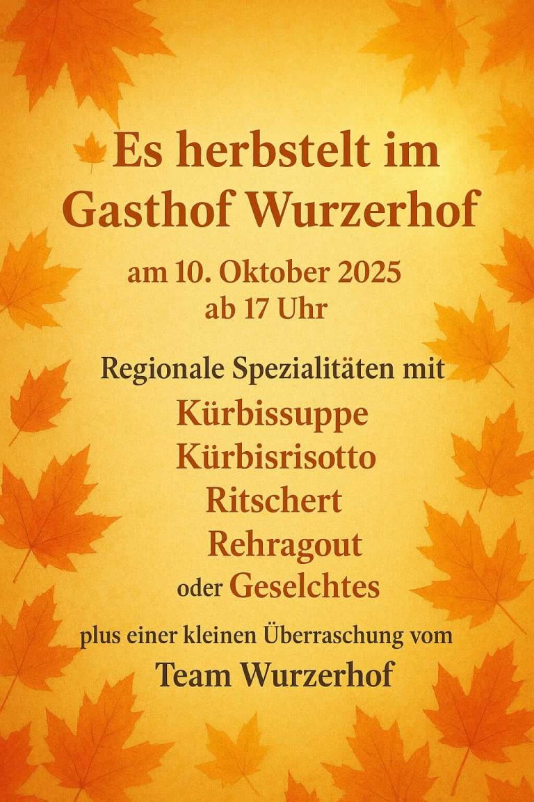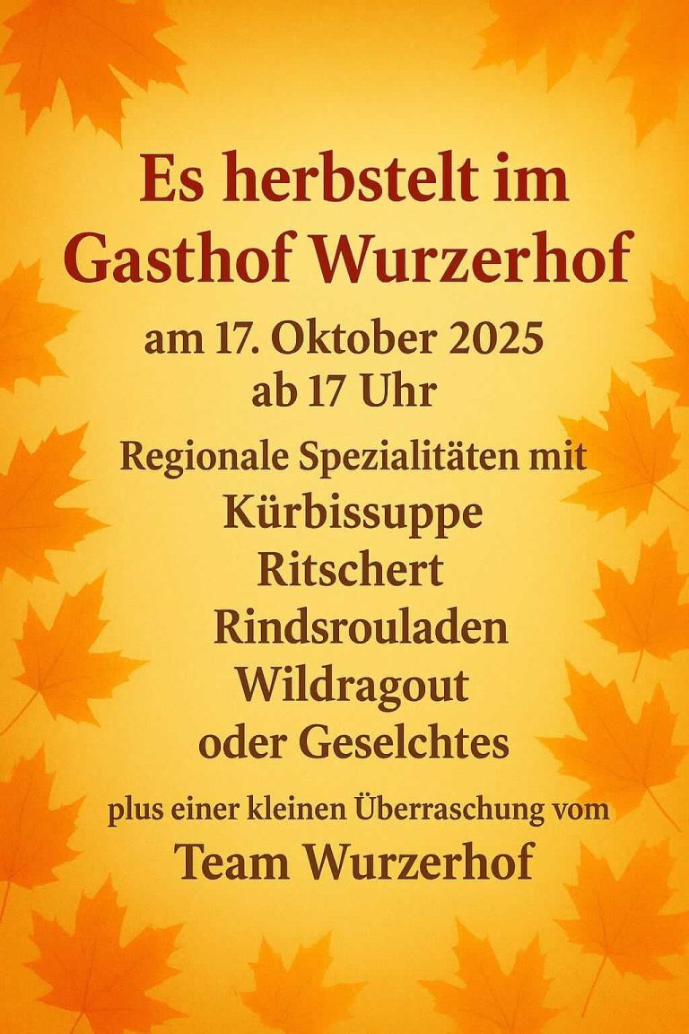 Aktuelles +43 42 62 / 50 150 gasthof@wurzerhof.com Öffnungszeiten Herbstfest 17. Oktober  Es herbstelt im Gasthof Wurzerhof in Meiselding Am Freitag, 17. Oktober 2025, ab 17 Uhr laden wir herzlich zu einem gemütlichen Herbstabend im Gasthof Wurzerhof in Meiselding ein.…