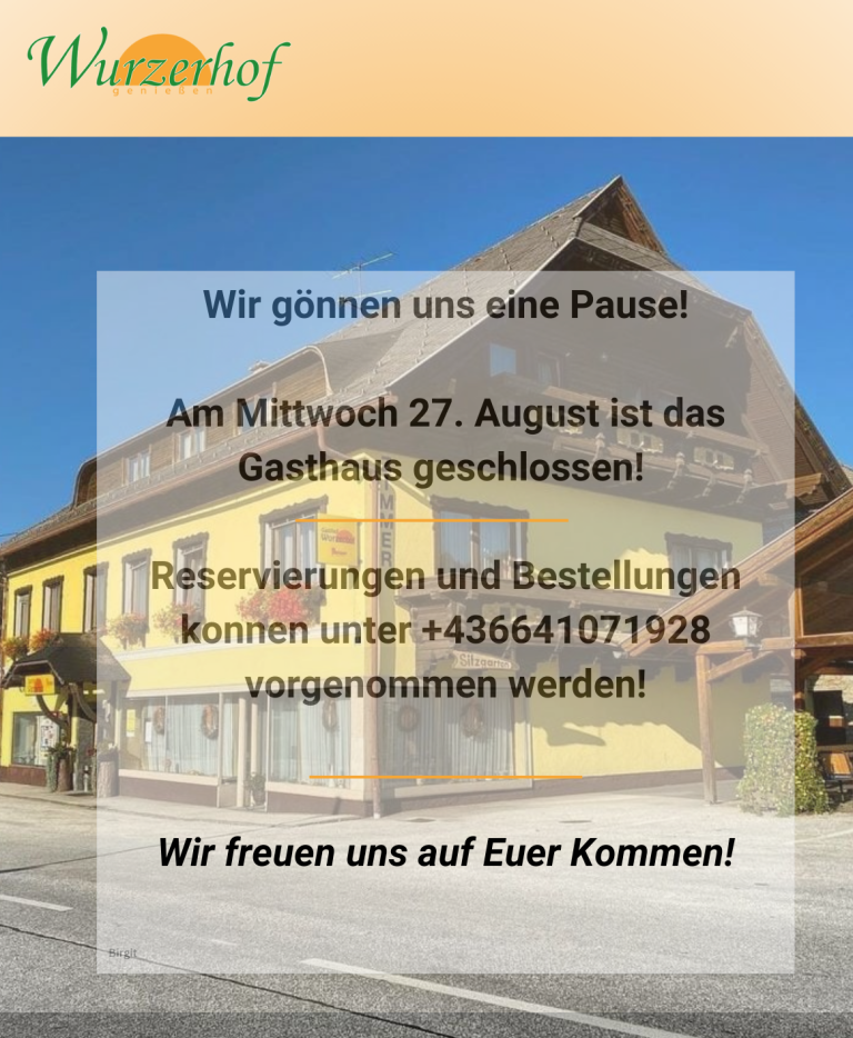 Aktuelles +43 42 62 / 50 150 gasthof@wurzerhof.com Öffnungszeiten Ruhetag  Wichtige Information für unsere Gäste Am Mittwoch, 27. August, haben wir einen Ruhetag. Reservierungen und Bestellungen nehmen wir gerne jederzeit unter +43 664 1071928 entgegen. Wir freuen uns schon jetzt auf dein Kommen und…