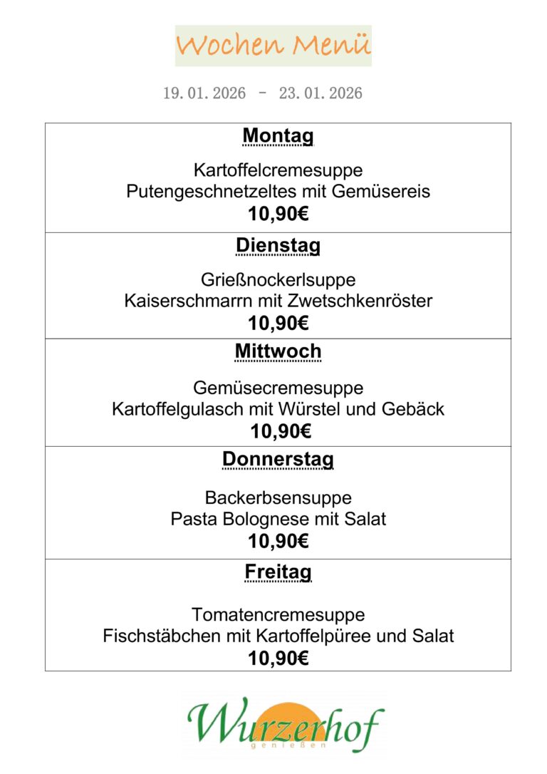 Aktuelles +43 42 62 / 50 150 gasthof@wurzerhof.com Öffnungszeiten Wochenmenü Unsere Wochenmenüs vom Montag bis Freitag Freut euch auf abwechslungsreiche, frisch gekochte Mittagsgerichte im Wurzerhof!Jeden Tag servieren wir euch ein köstliches Menü mit Suppe und Hauptspeise – natürlich hausgemacht und…