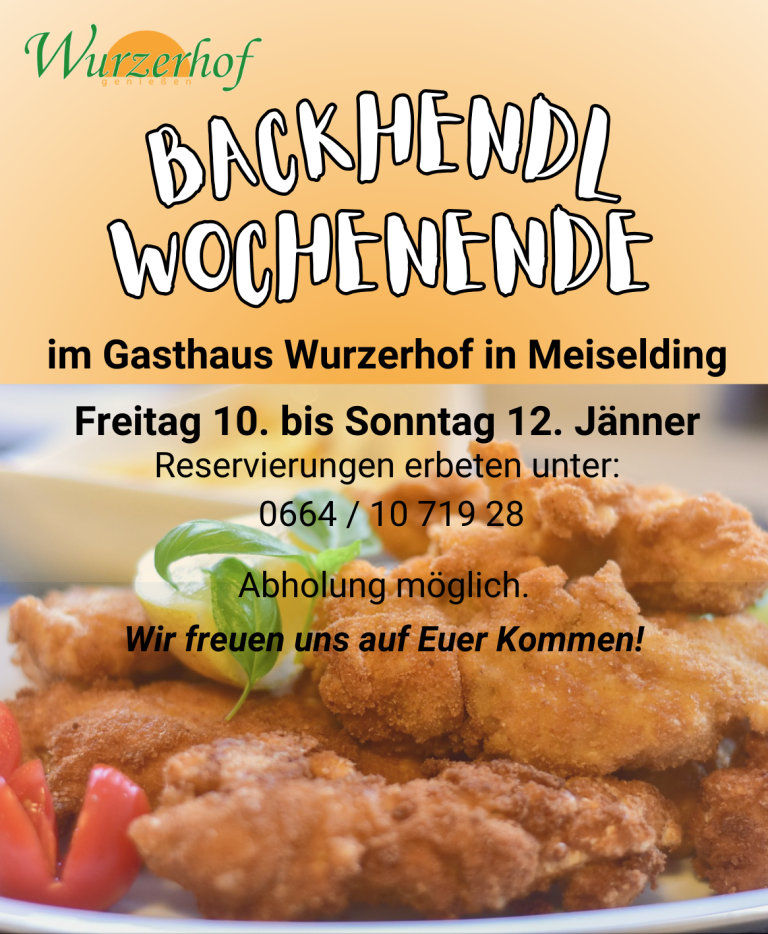 Aktuelles +43 42 62 / 50 150 gasthof@wurzerhof.com Öffnungszeiten Backhendl Einladung zum Backhendl Wochenende  im Gasthaus Wurzerhof in Meiselding! Liebe Gäste, freut euch auf unser traditionelles Backhendl-Wochenende! Von Freitag, den 10. Jänner, bis Sonntag, den 13. Jänner 2025, verwöhnen wir…