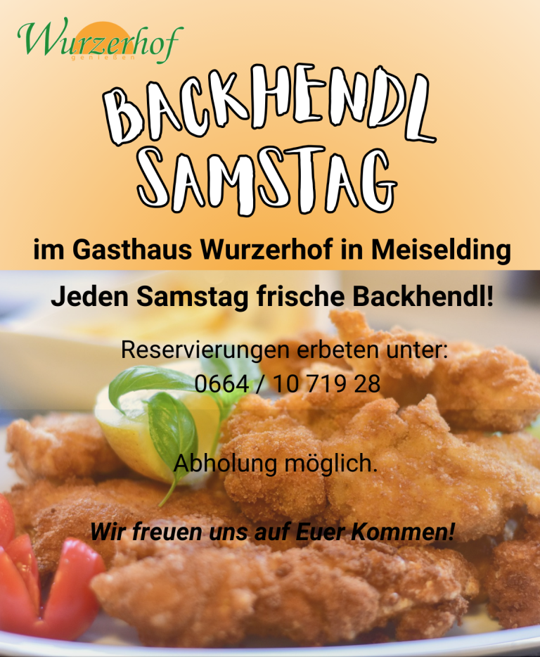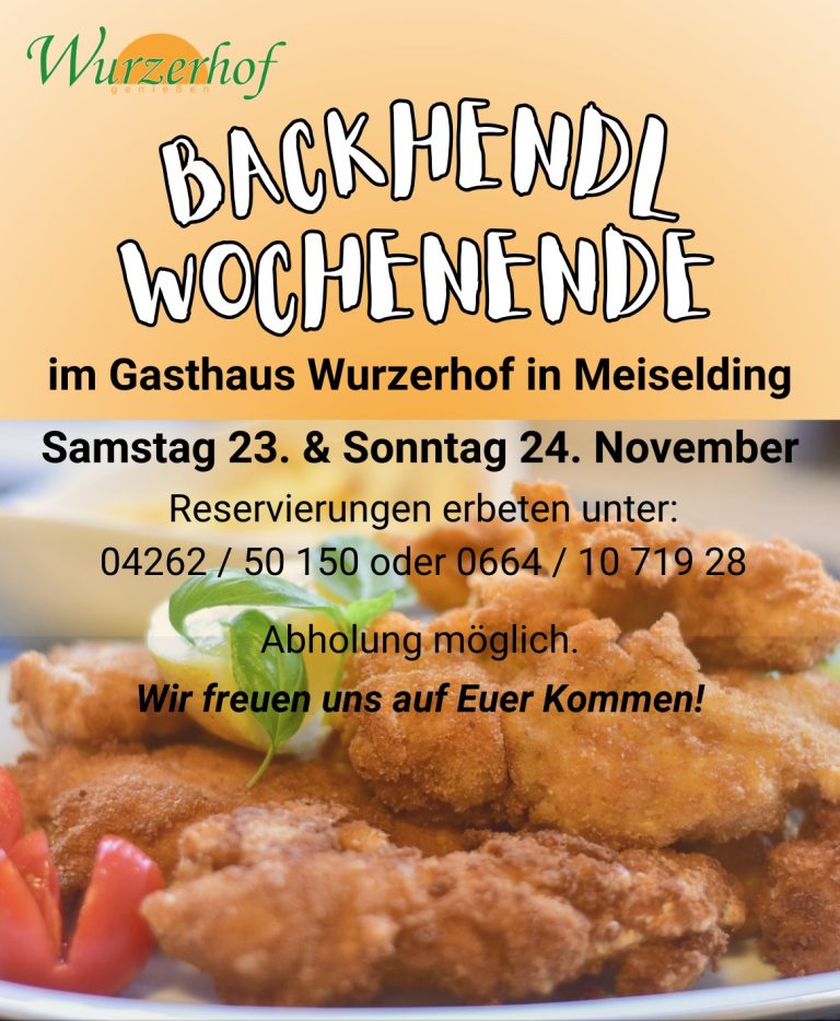 Aktuelles +43 42 62 / 50 150 gasthof@wurzerhof.com Öffnungszeiten Backhendl Einladung zum Backhendl Wochenende  im Gasthaus Wurzerhof in Meiselding! Wir laden euch herzlich zu unserem Backhendlschmaus im Gasthaus Wurzerhof in Meiselding ein! Am Samstag, den 23., und Sonntag, den 24.…