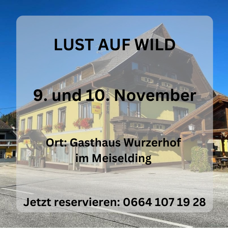 Aktuelles +43 42 62 / 50 150 gasthof@wurzerhof.com Öffnungszeiten Lust auf Wild Lust auf Wild im Gasthaus Wurzerhof in Meiselding! Wir laden Sie herzlich zu unserem „Lust auf Wild“ Wochenende ein, das am Samstag, den 9. und Sonntag, den 10.…