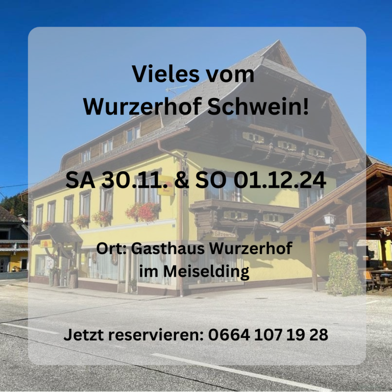 Aktuelles +43 42 62 / 50 150 gasthof@wurzerhof.com Öffnungszeiten Vieles vom Schwein Einladung: Vieles vom Wurzerhof Schwein am 30.11. und 1.12.! Am kommenden Wochenende verwöhnen wir euch mit köstlichen Gerichten, zubereitet aus unseren eigenen Produkten vom Wurzerhof!  Auf der Speisekarte: Gefüllter…