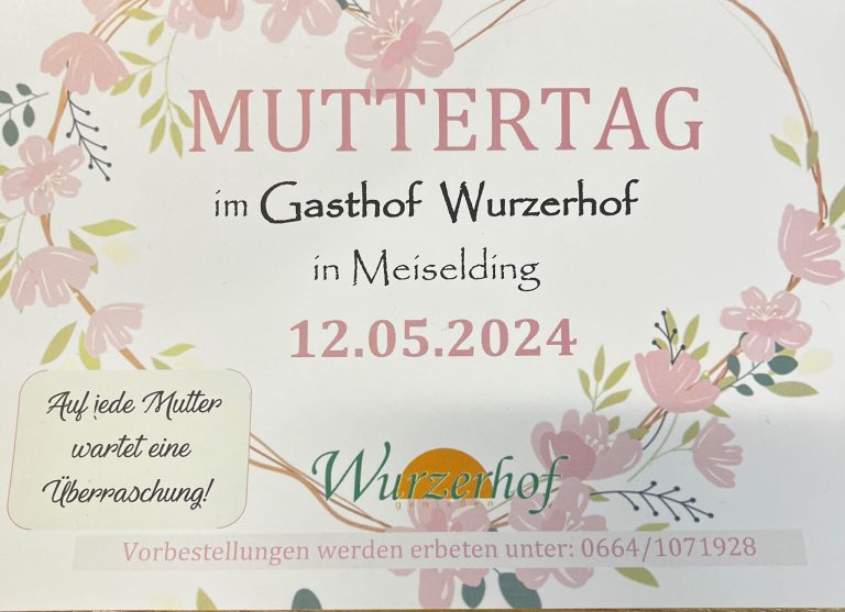 Aktuelles +43 42 62 / 50 150 gasthof@wurzerhof.com Öffnungszeiten Muttertag Muttertagsmenü im Gasthaus Wurzerhof in Meiselding Wir laden euch herzlich ein, den Muttertag im Gasthaus Wurzerhof in Meiselding zu feiern! Am Sonntag, den 12. Mai 2024, erwartet euch ein besonderes…